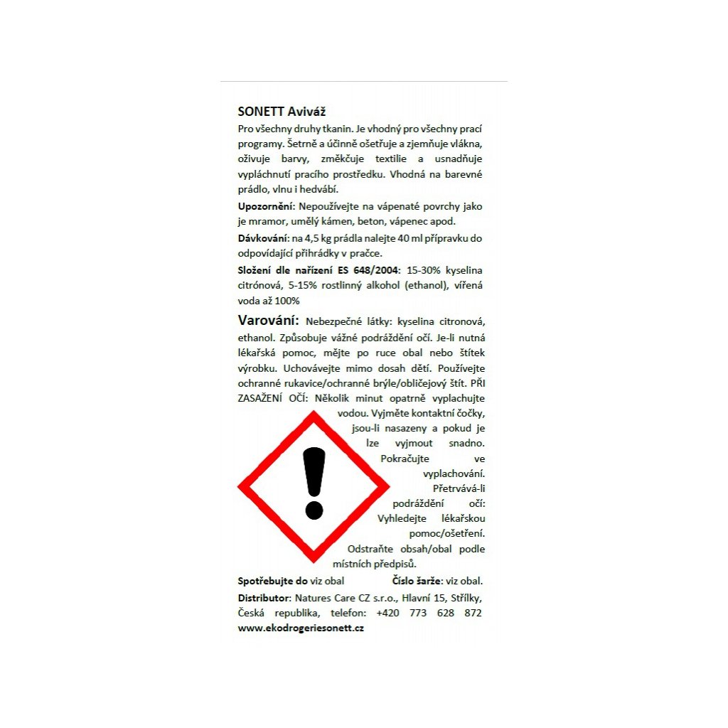 Distributor pro ČR: Sonett, Natures Care CZ s.r.o., Hlavní 15, 76804 Střílky, Natures Care CZ s.r.o., Nádražní 190, 76805 Koryčany, Telefon: +420 733 699 050, email: objednavky@sonett.cz