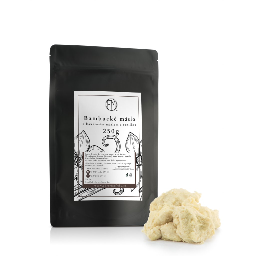 Výhodné bambucké máslo na výrobu šlehaného bambuckého másla s kakaovým máslem a vanilkou. Voní sladce - po vanilce. Esenciální olej z vanilky krásně provoní celé tělo a příznivě působí na vaši mysl. Kakaové máslo má vynikající hojící a regenerační schopnosti a podporuje elasticitu pokožky.