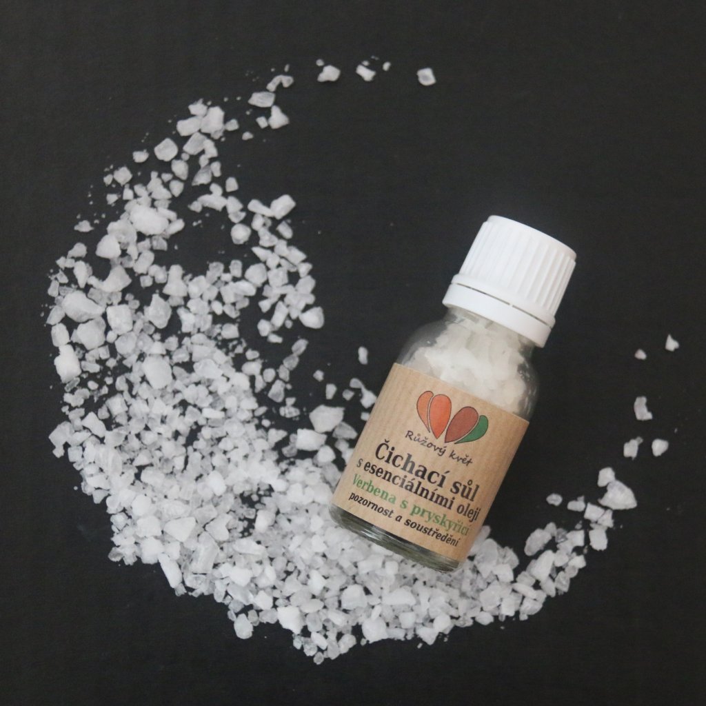 Aromaterapeutická čichací sůl Verbena s pryskyřicí - pozornost a soustředění, obsahující směs esenciálních olejů z každé skupiny vůní - kadidlovník, sladký pomeranč, muškátový oříšek a verbena citrónová.