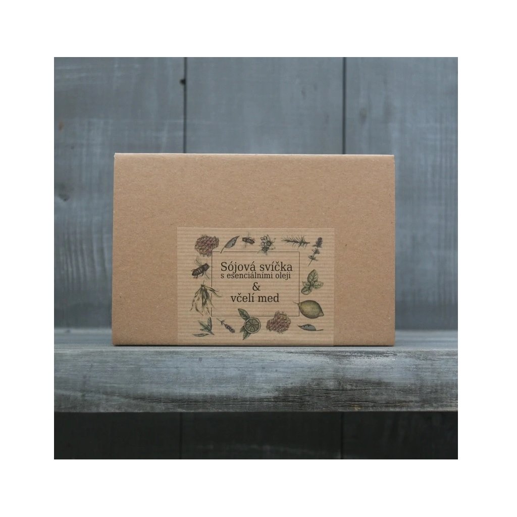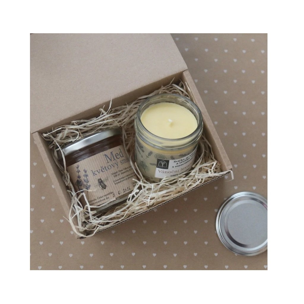 Dárkový box Sójová svíčka s medem obsahuje aromaterapeutickou svíčku Šťavnaté citrusy (popřípadě další vůně) a květový smíšený med od včelek. Krabička je vystlaná dřevitou vlnou a opatřená etiketou. V tomto dárkovém balíčku mohou být různé svíčky.