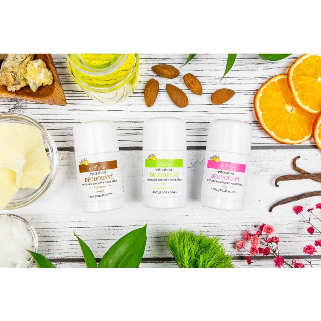 Přírodní deodorant s účinkem smrkové pryskyřice, která je antibakteriální. Neobsahuje jedlou sodu, která nemusí vždy vyhovovat a může dráždit pokožku. O zjemnění a vyživení pokožky se postará kakaové máslo, mandlový olej a kokosový olej. Chrání před pachem a množení bakterií, kterému zabrání vhodná kombinace přírodních surovin v čele se smrkovou pryskyřicí.