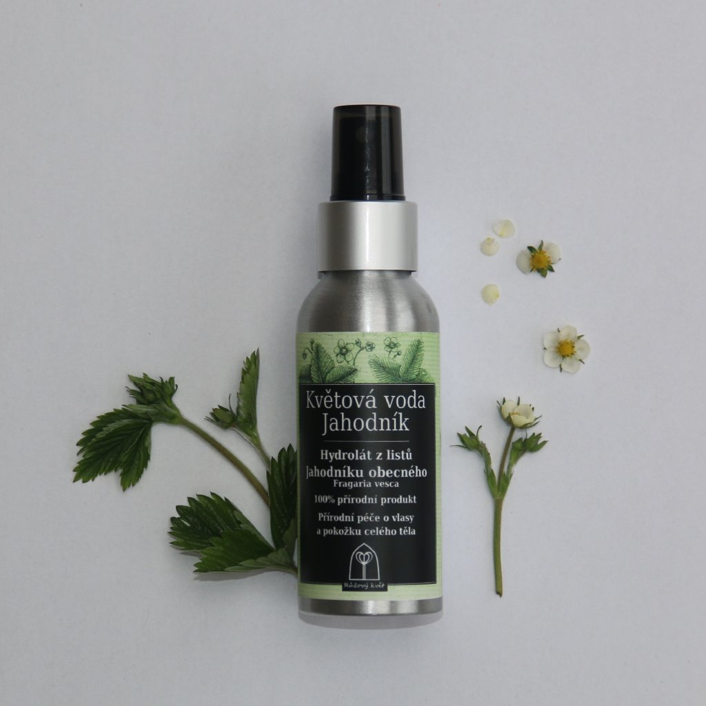 Jahodník obecný není v kosmetice příliš rozšířená bylinka a ani květová voda se z něho běžně nevyrábí. Do výroby jsme tuto květovou vodu zařadili jednak z důvodu dobré dostupnosti suroviny, dále proto, že má díky tříslovině lehce stahující účinky a navíc obsahuje silici, ale velmi jemnou, nedráždivou, takže se hodí pro opravdu velmi citlivou pleť a také proto, že jahody jsou často součástí kosmetických produktů a nejrůznějších pleťových masek. Také jsme toho názoru, že bychom si měli vážit bylinek, které u nás rostou jako ty domácí, původní. Takové k nám mají vždy nejblíže. Výsledná vůně této květové vody je lehká, zelená a sladká po listech, květech a ovoci.