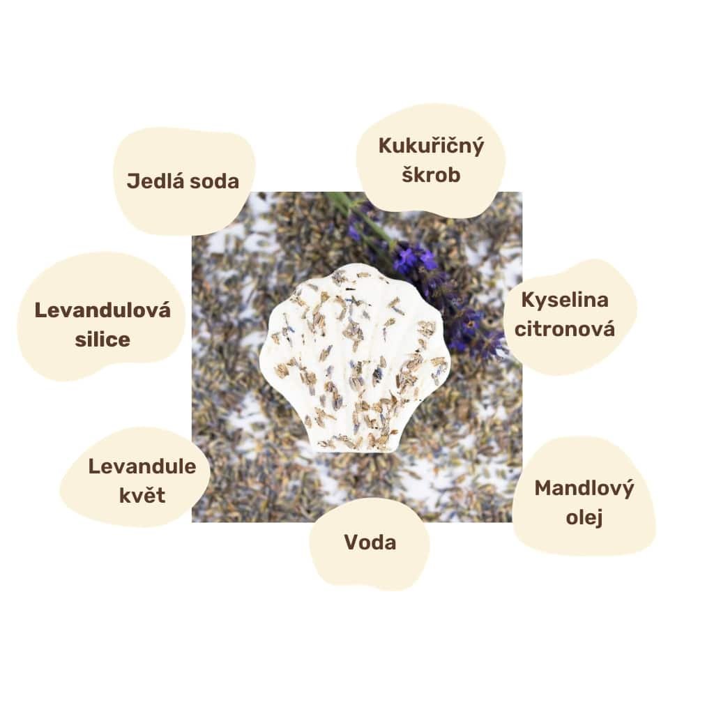 Sodium Bicarbonate, Distarch Phosphate, Citric Acid, Prunus Amygdalus Dulcis Oil, Aqua, Lavandula Angustifolia Flower, Lavandula Angustifolia Oil, Linalool.