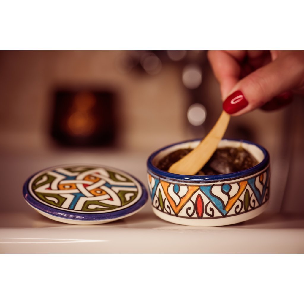 Keramická dózička z marocké keramické dílny s rybičkovým dekorem.  Perfektní na uskladnění bambuckého másla, sidru, černého mýdla nebo čehokoliv, co chceš mít v koupelně nebo kdekoliv jinde po ruce.