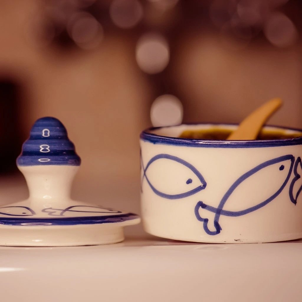 Keramická dózička z marocké keramické dílny s rybičkovým dekorem. Perfektní na uskladnění bambuckého másla, sidru, černého mýdla nebo čehokoliv, co chceš mít v koupelně nebo kdekoliv jinde po ruce.