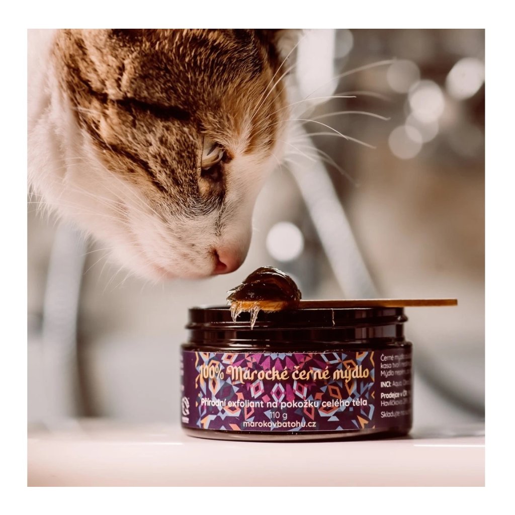 100% marocké černé mýdlo je vyrobeno z černých oliv. Narozdíl od “našeho” mýdla nemá pevný tvar, ale jedná se o mazlavou pastu. Nanes ji na vlhkou nahřátou pokožku a pořádně rozetři. Mýdlo nepění - celá akce připomíná spíš mazání krémem. Na kůži nech několik minut působit, pak smyj vodou a jemně se osuš (tak, aby kůže stále byla vlhká).