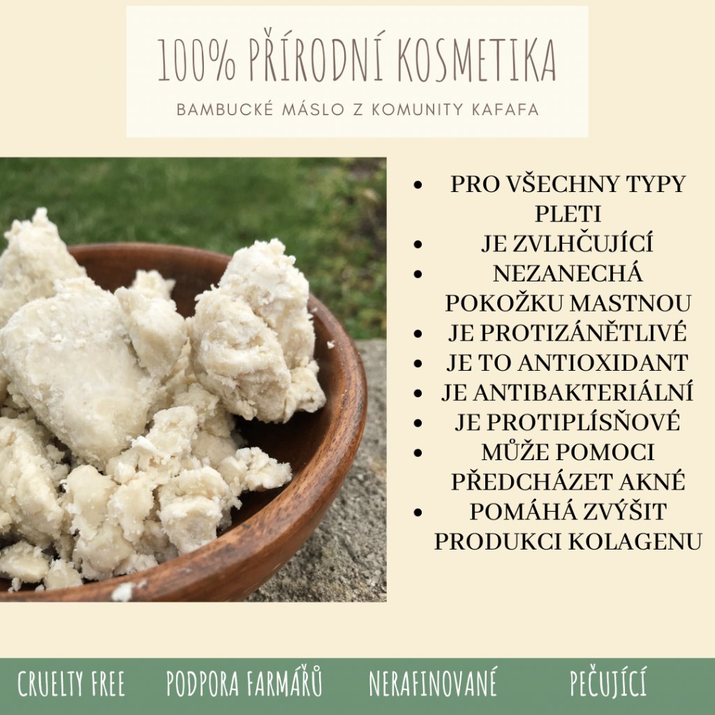 Bambucké máslo je 100% rostlinný produkt. Při výrobě se nepoužívají žádné živočišné produkty a ani není testováno na zvířatech.