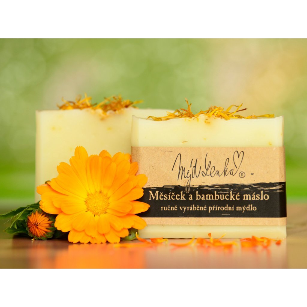 Nádherné a jemné tuhé přírodní měsíčkové mýdlo s bambuckým máslem, olivovým olejem, ve kterém byly macerovány květy měsíčku lékařského a s okvětními lístky měsíčku lékařského.
