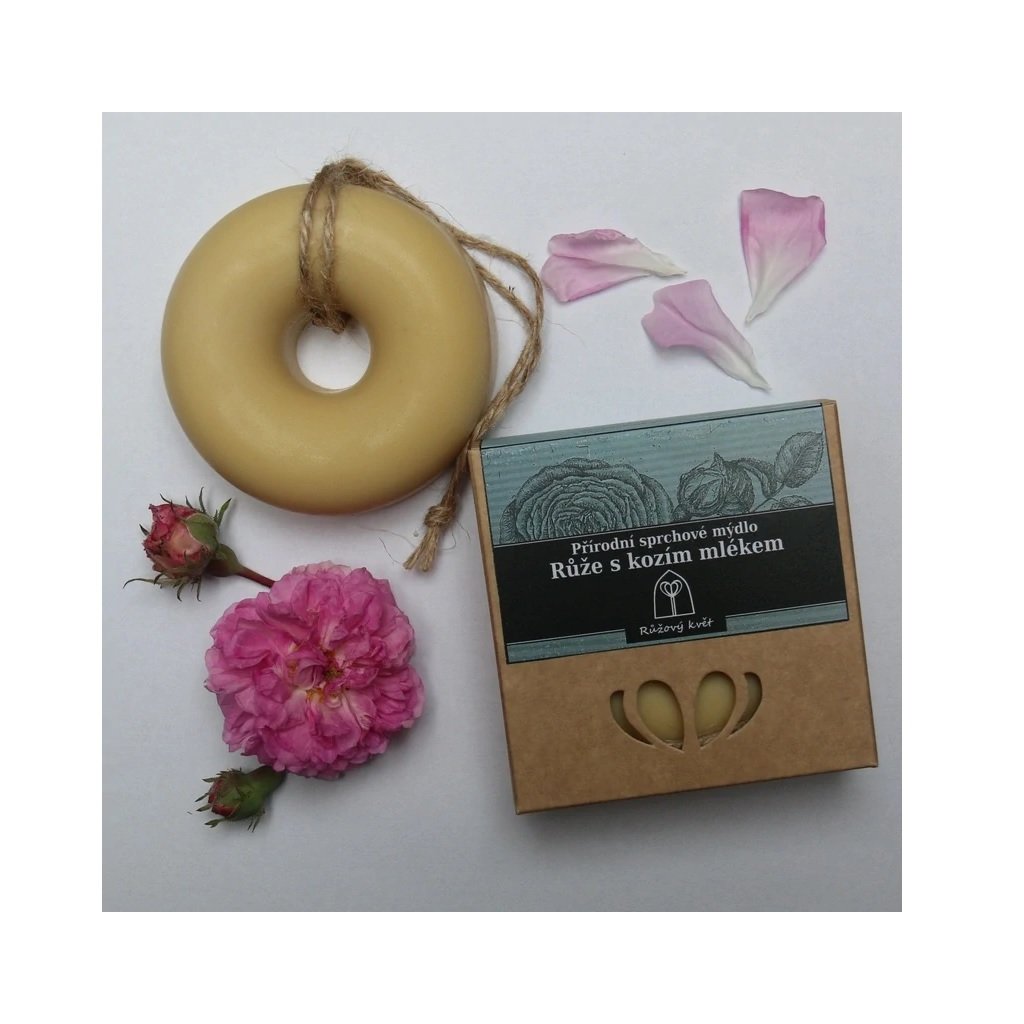 Sprchové mýdlo Růže s kozím mlékem (s jutovým provázkem na zavěšení) je mýdlo pro mytí pokožky rukou a celého těla, v jehož složení je oblíbená Růže stolistá. Mýdlo obsahuje kozí mléko, které má blahodárné účinky na pleť a vůni doplňuje kromě květové vody ještě esenciální růžový olej (z růže stolisté). Mýdlo je vyráběné metodou zastudena.