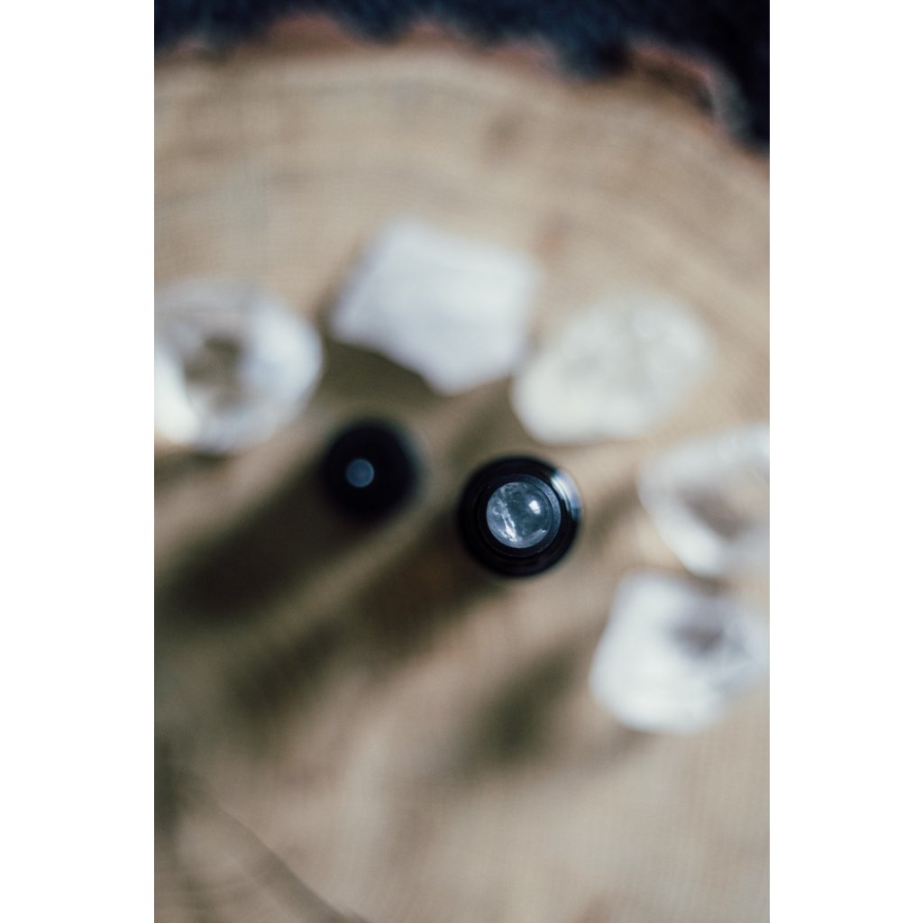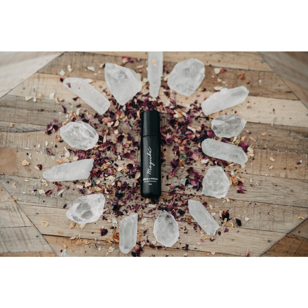 Parfém je energeticky ošetřen a nabíjen krystalickou mřížkou krystalů: Rodochrozit, který posilňuje kouzlo sebelásky, dodává energii, uklidňuje tělo a emoce. Měsíční kámen, ženský kámen bohyně posilující šarm a ženskou esenci. Stříbro, esence lunárního cyklu a světla. Tuhle silnou trojici doplňuje křišťálová kulička v roll-onu. Dovol si zářit. Dovol se otevřít své magické ženě a vysokým vibracím světla a lásky.