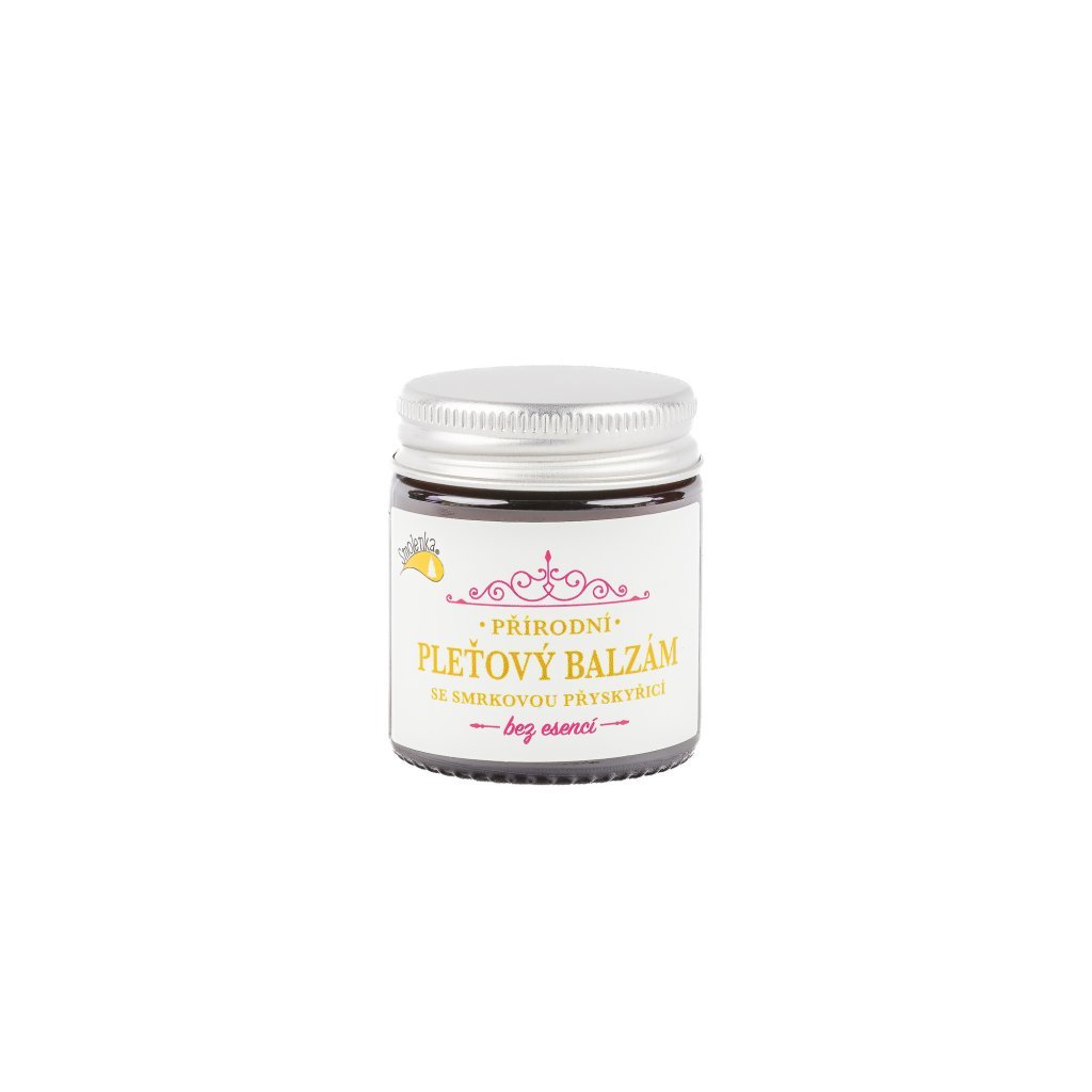 Přírodní pleťový balzám se smrkovou pryskyřicí bez esencí. Balzám pro hebkou pleť z přírodních másel a olejů. Významnou surovinou je hroznový olej, který pleť vyhladí a zvláční.
