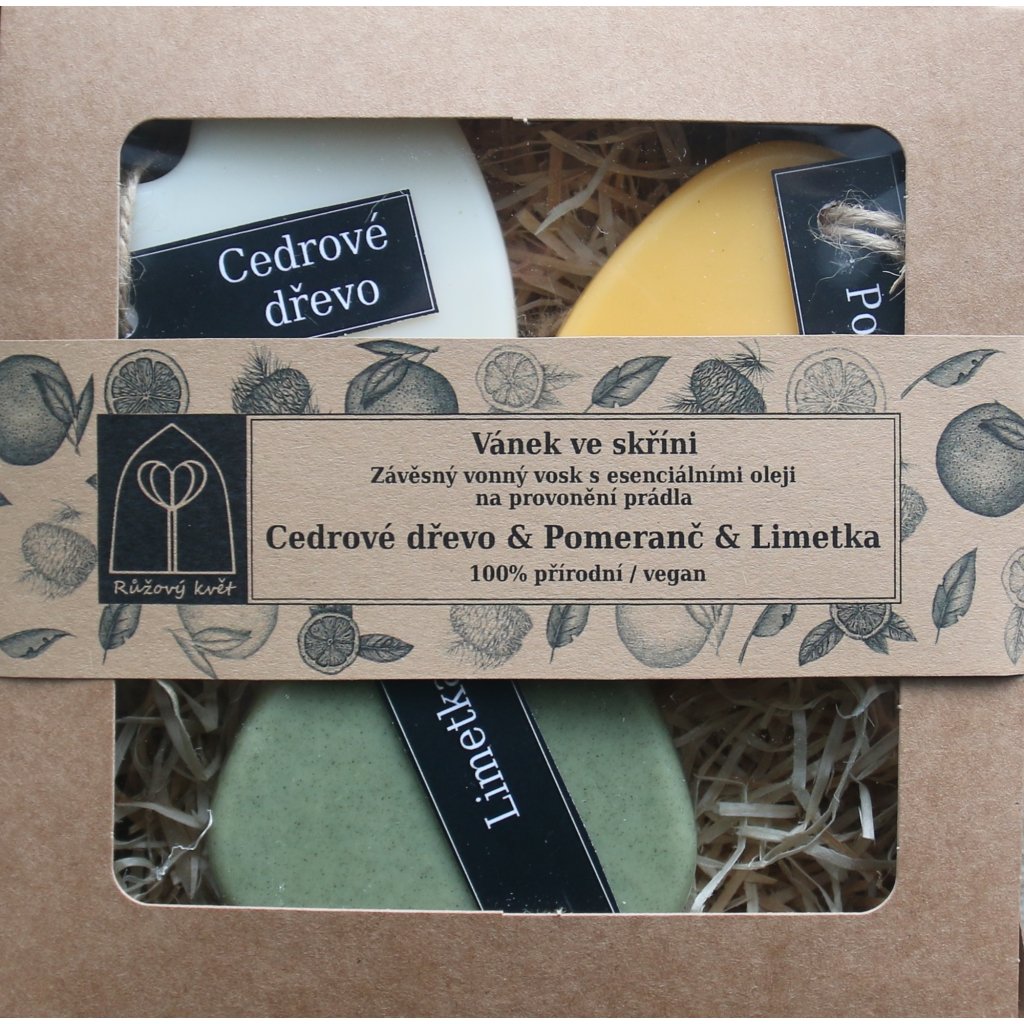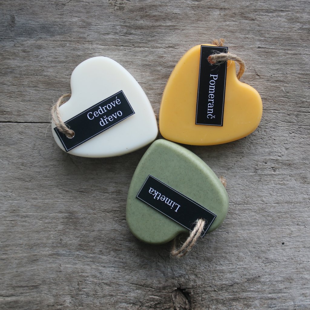 Vánek ve skříni - cedrové dřevo, pomeranč, limetka. 3 ks závěsná srdce k provonění šuplíků, skříní, komod, šatníků i menších místností. Srdce jsou vyrobena ze sójového vosku a esenciálních olejů, některá obsahují bylinky. Barveno pomocí urucum a chlorelly.