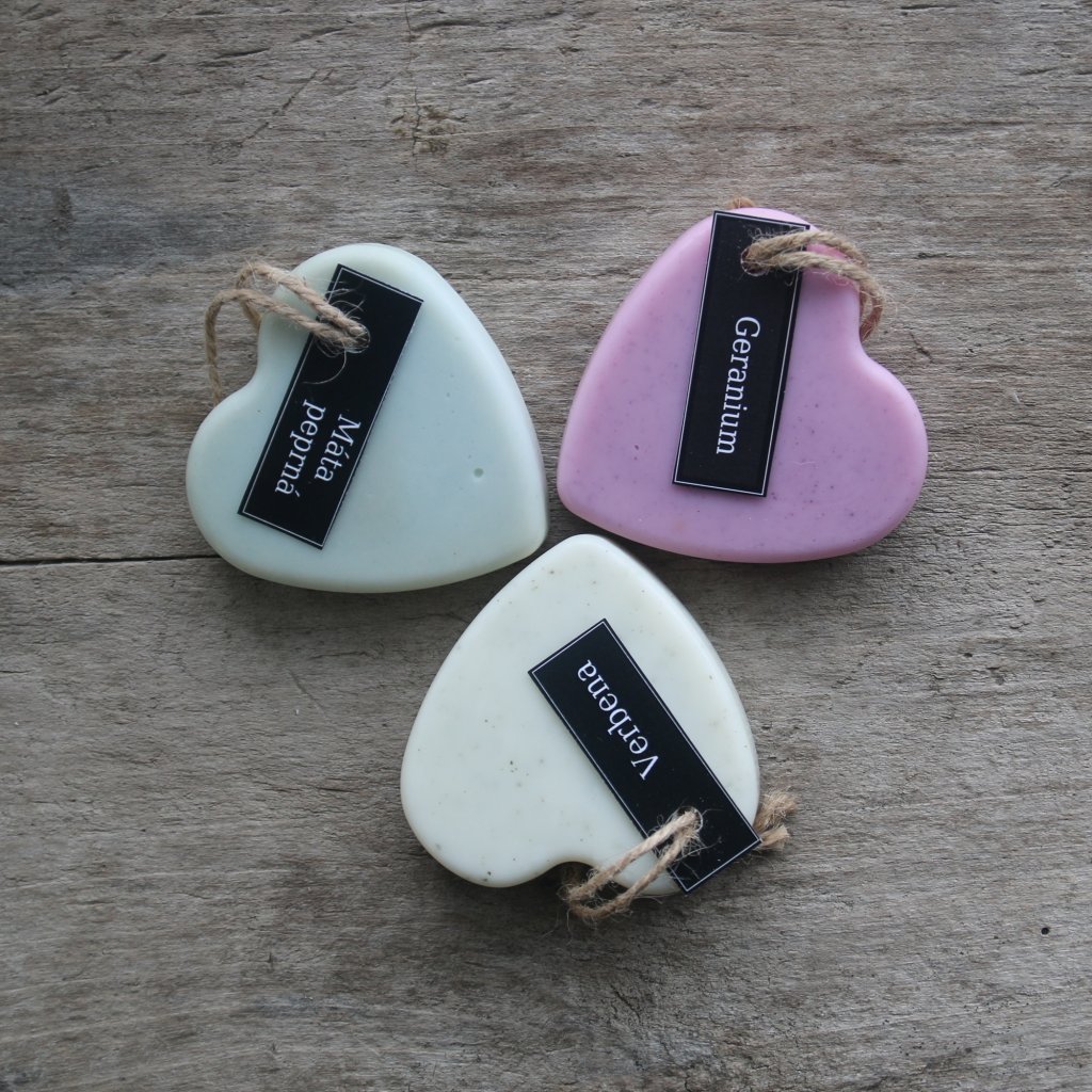 Srdce jsou vyrobena ze sójového vosku a esenciálních olejů, některá obsahují bylinky. Barveno pomocí chlorelly, drcené verbeny a růžového oxidu. Srdce má průměr 7 cm a lze ho zavěsit samostatně, po dvou či po třech, podle velikosti prostoru a požadované vůně.  Každé srdce váží +-40 g a obsahuje 2 až 3 ml esenciálních olejů (podle druhu). Sójový vosk je dobrý a dlouhodobý nosič vůně.  Esenciální oleje nejen krásně voní, ale také odpuzují nezvané hmyzí návštěvníky v našich skříních. Srdíčko lze také použít jako vonný vosk do aromalampy. Můžete ho nalámat na kousky, rozpustit v aromalampě a provonět si tak celý byt.