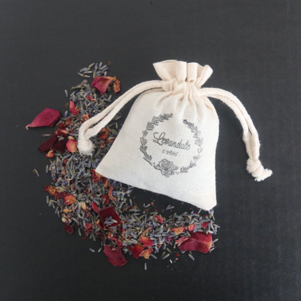 Vonný bavlněný sáček Levandule s růží o velikosti 9 x 10 cm obsahuje směs sušených bylin (levanduli lékařskou, levanduli prostřední a růži stolistou) ovoněnou přírodními esenciálními oleji levandule lékařské a rose geranium.