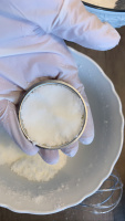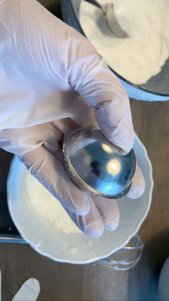 A teď přichází to „nejtěžší“. Směs musíte za stálého míchání zvlhčovat. Ale opravdu zvolna. Musíte ji dostat do fáze, kdy při tvarování rukou do kuličky bude držet tvar, ale zároveň bude ještě lehce sypká. Když to přeženete s vodou, stane se vám, že ve formičkách nabobtná a vyšumí. A pak si jimi můžete ovonět maximálně tak mytí nádobí.