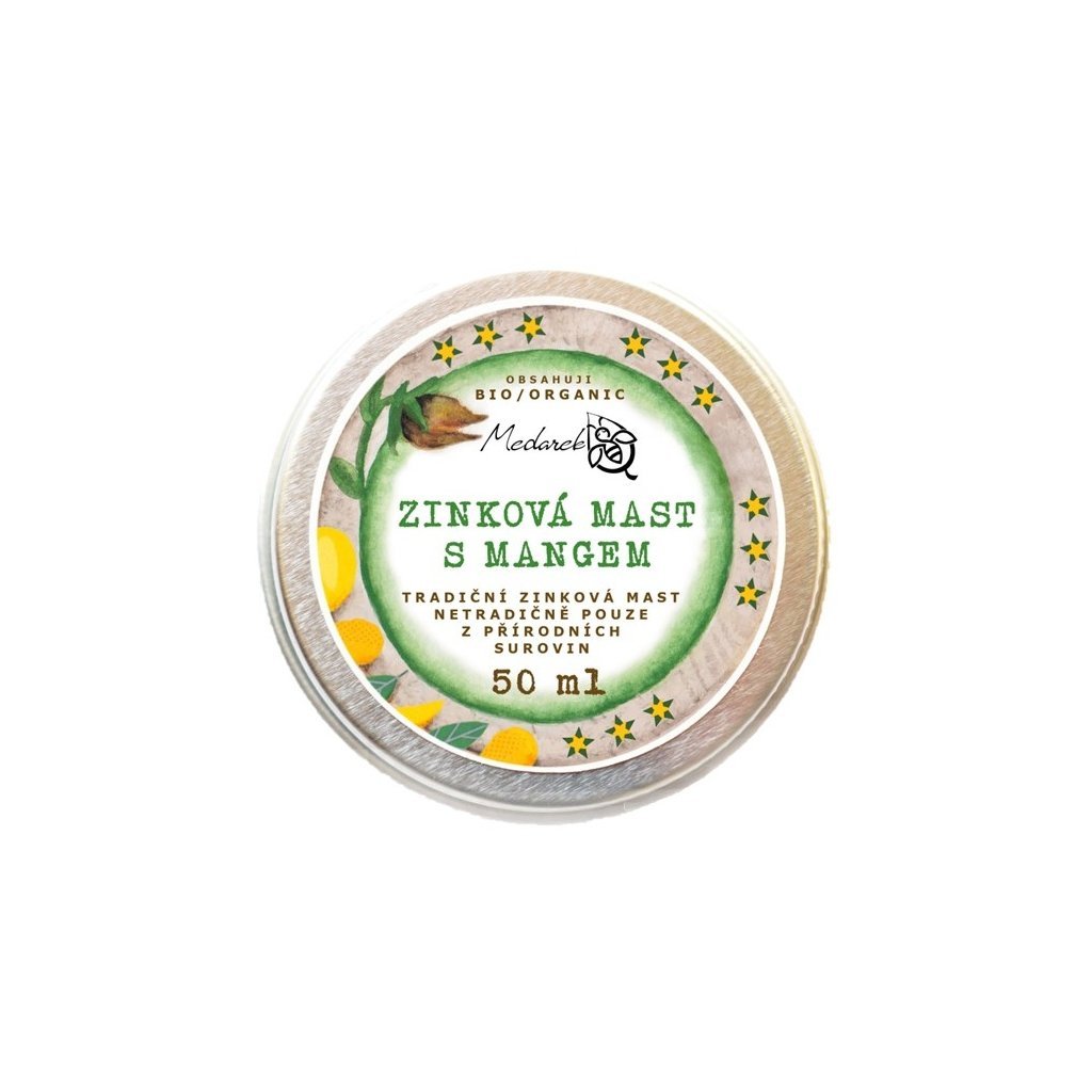 Zinková mast v klasické verzi, pouze jsme vyměnili bambucké máslo za mangové. Část zákazníků má totiž alergii na ořechy, která se projevovala i u bambuckého másla.